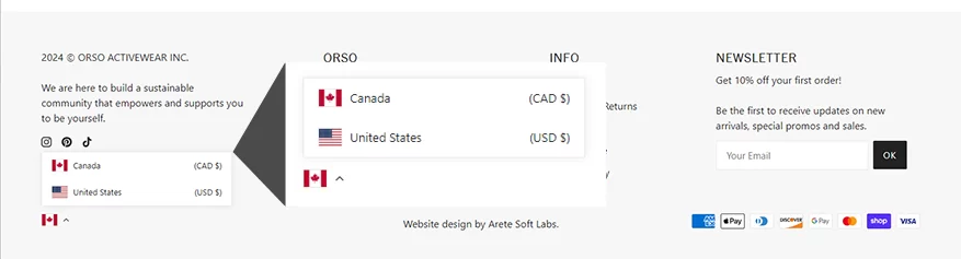 To accommodate Orso’s international customer base, we implemented multi-currency support with dynamic price updates in USD and CAD. This feature enabled customers to view product prices in their local currency, fostering transparency and reducing friction in the purchasing process.