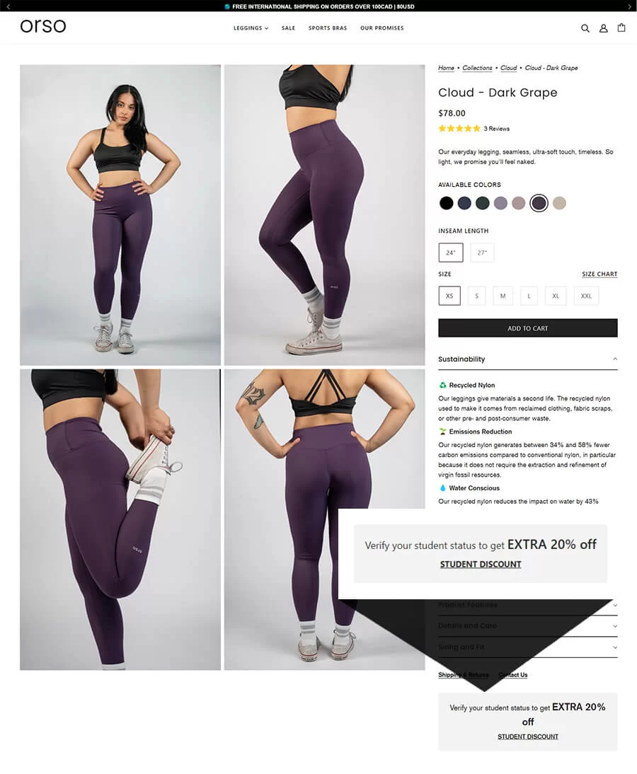 Our team implemented bespoke product pages with dynamic features such as color, size, and inseam length options ensuring customers can order the product with accuracy and minimize returns. Additionally, we prominently featured the student discount feature to incentivize student engagement and foster brand loyalty among this demographic.